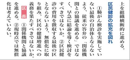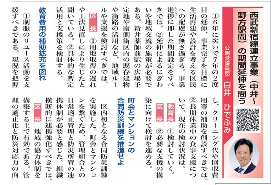 【質問項目】 1.西武新宿線連続立体交差事業(中井駅~野方駅間)の期間延伸について 2.教育に関する費用負担補助等について 3.防災対策について 4.中野区基本計画と区有施設整備計画の改定について 5.区民健診等について 6.その他